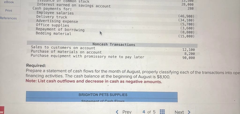 Prepare a statement of cash flows for the month of August, properly classifying each of the transactions into operating, investing, and financing activities.